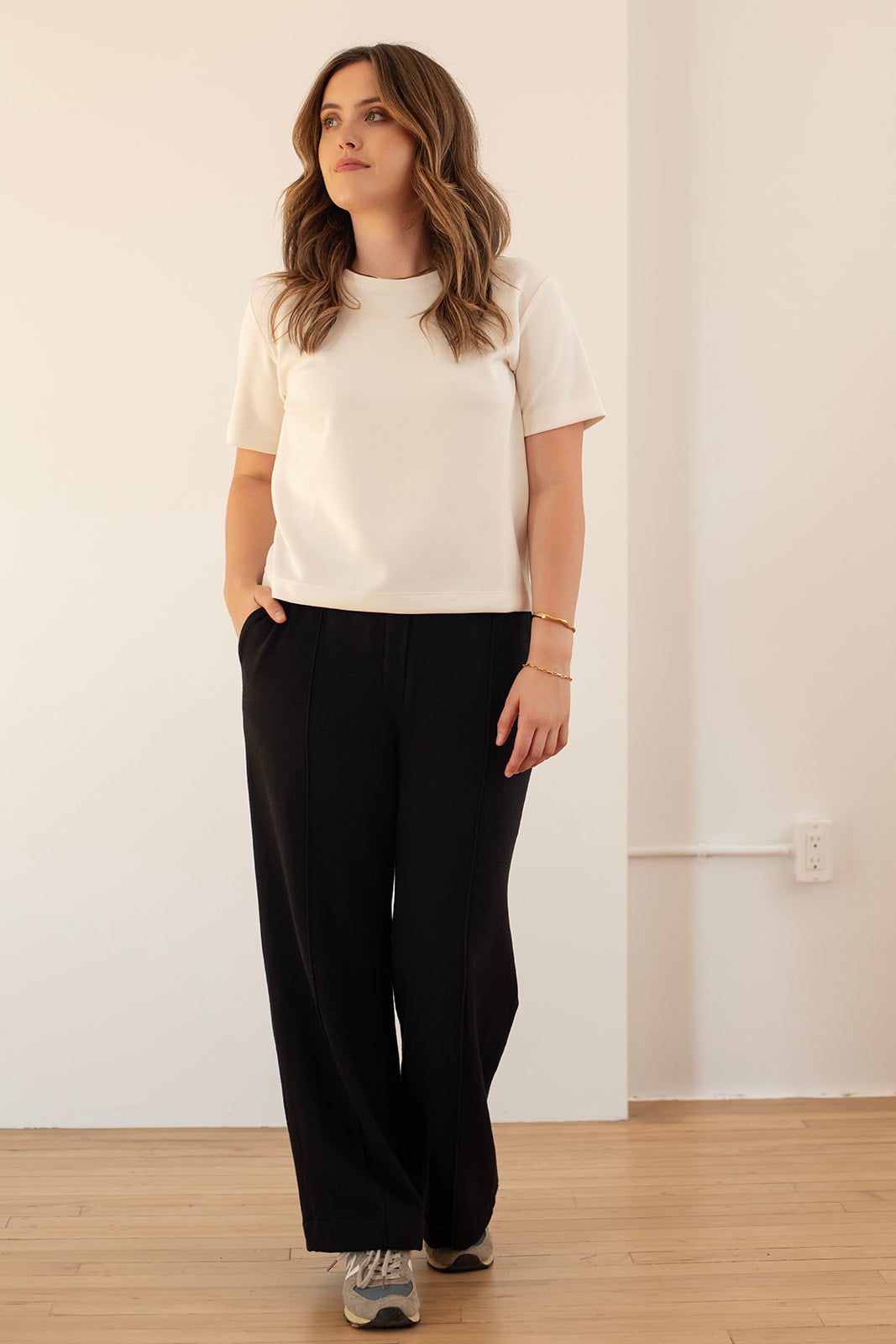 Effortless sophistication meets everyday comfort. The Black Bamboo Trouser features a clean, tapered silhouette with a sewn-in pin-tuck detail that subtly elongates the leg. A 2" elastic waistband ensures a pull-on ease, while discreet quarter-top pockets and a streamlined fake fly front keep the look polished. Crafted in a breathable bamboo-cotton blend with a hint of stretch, this timeless black trouser is as refined as it is wearable—perfect for dressing up or down.