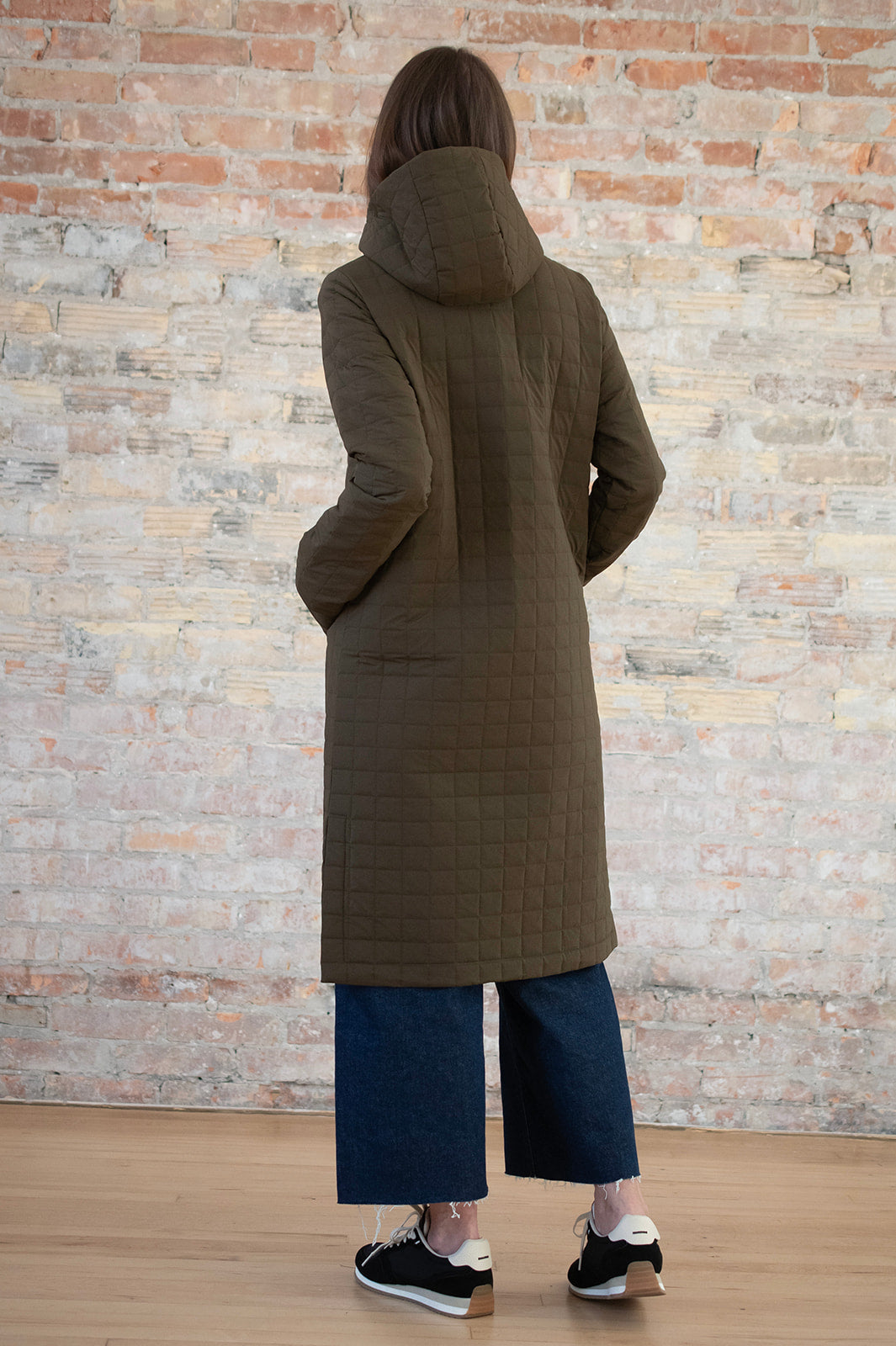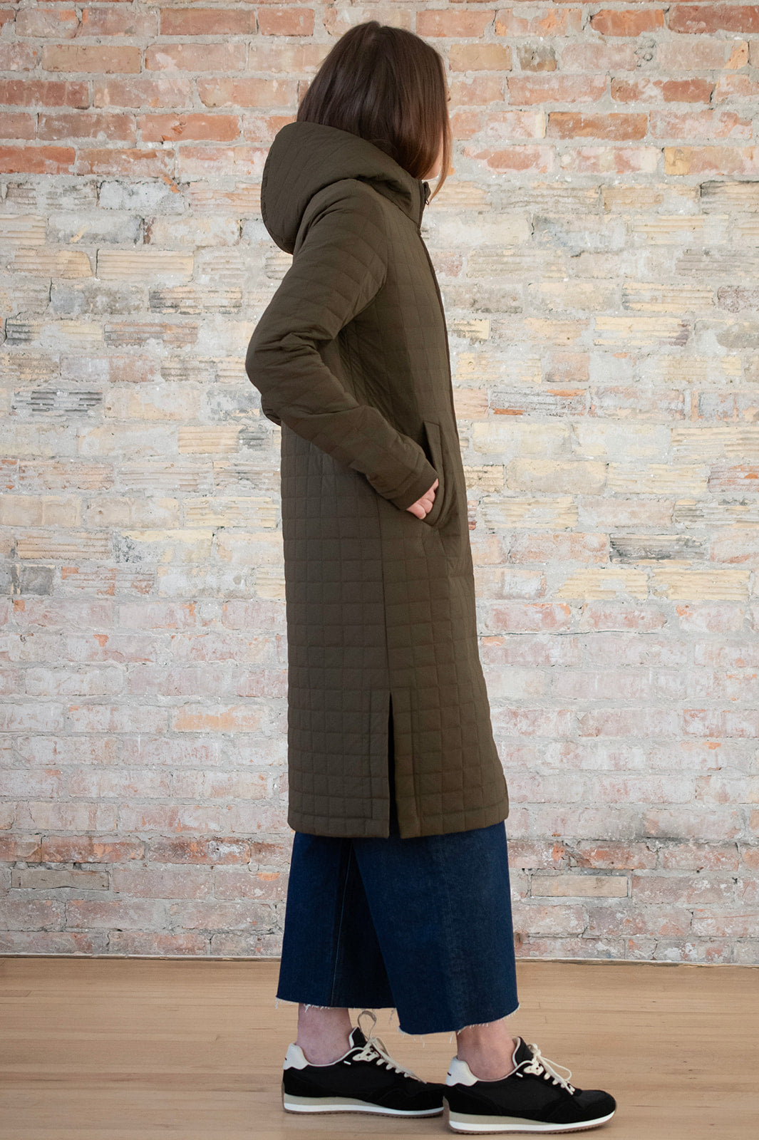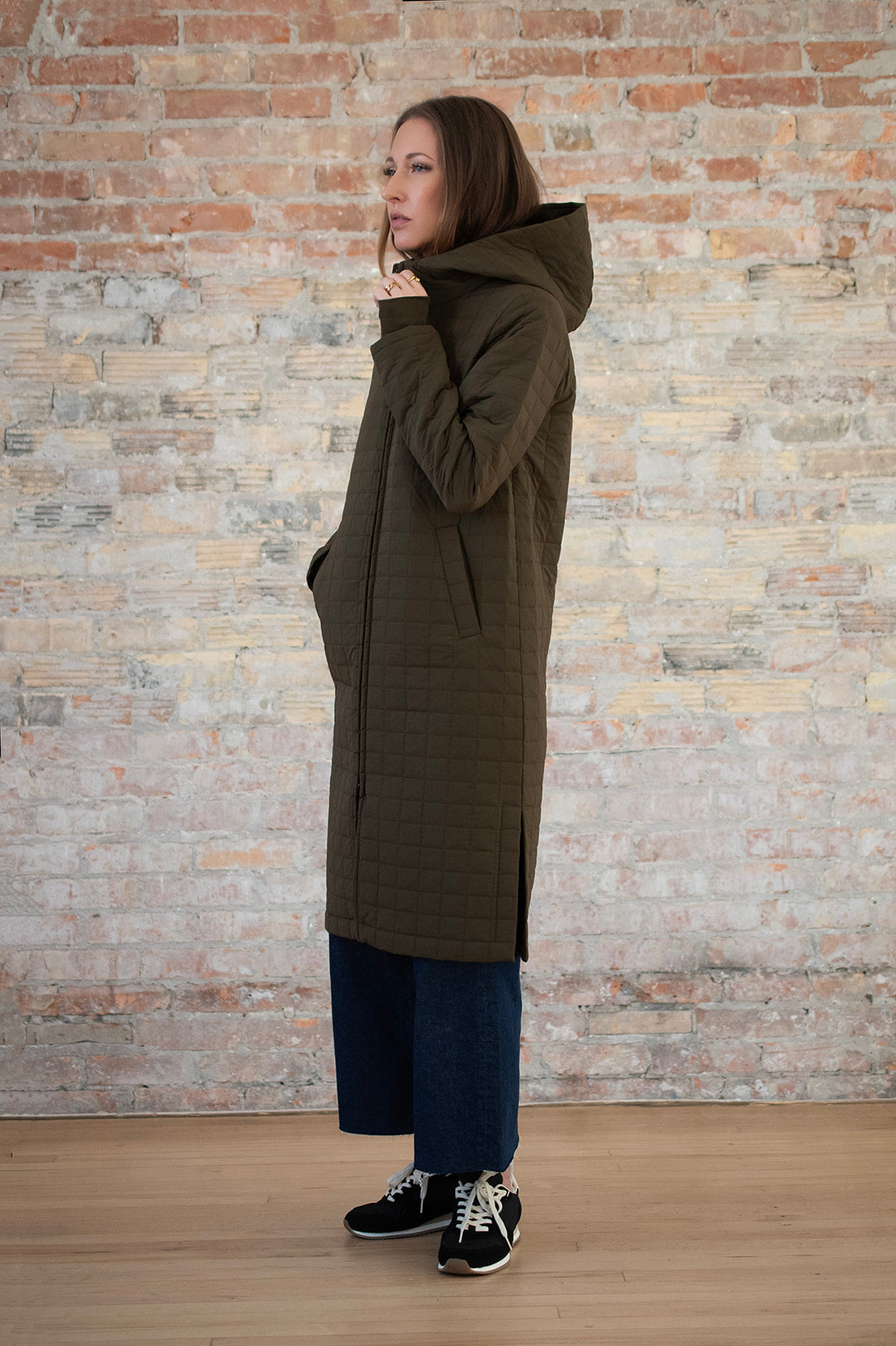 Minimal and technical with a modern silhouette. This medium-weight quilted coat is designed for modular warmth and everyday versatility. Cut in an elongated shape with side seam slits for ease of movement, it features a double-ended zipper, welt pockets, a cozy hood, and soft knit cuffs with thumbholes for added function and comfort. Wear it on its own or layer it with the matching overlay vest for extra insulation.