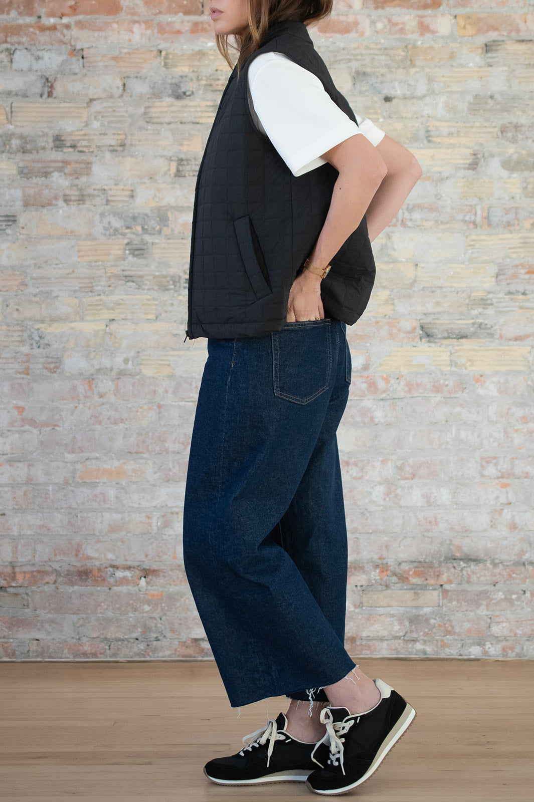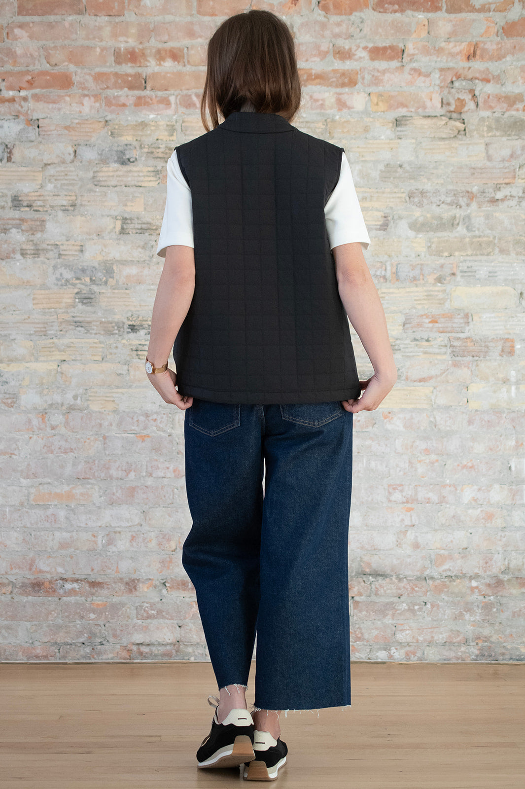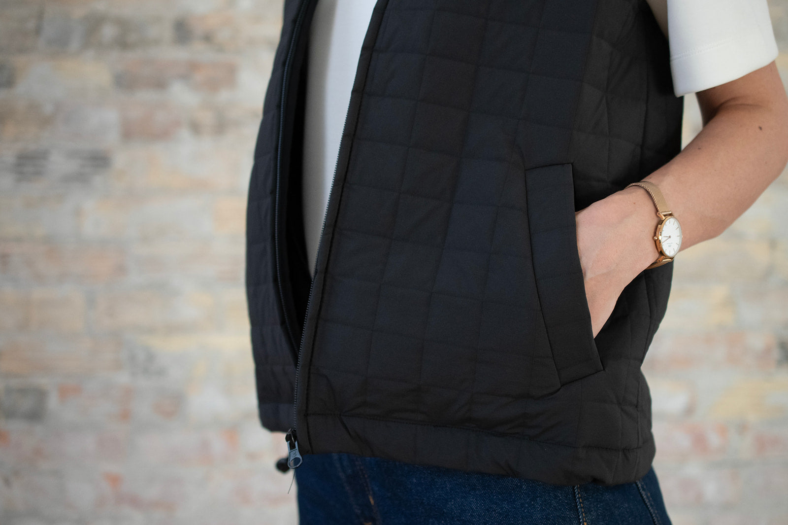 A versatile, sleeveless quilted vest designed to layer seamlessly over your coat or knitwear. Made from the same medium-weight nylon-spandex fabric as the Long Line Coat, it adds modular warmth and style without bulk—perfect for adapting to changing weather and layering needs.