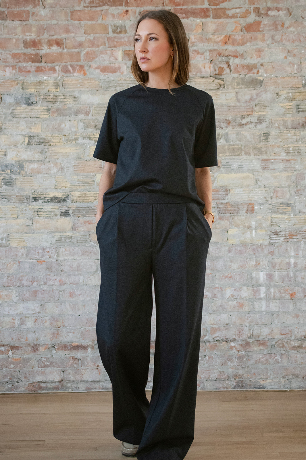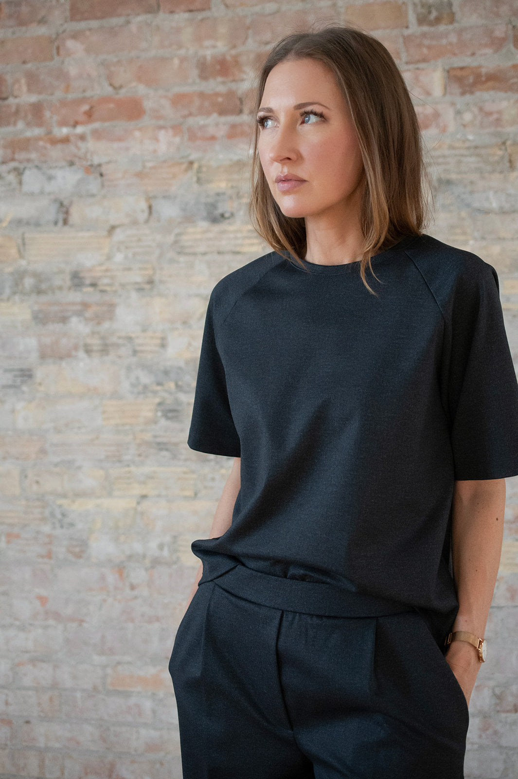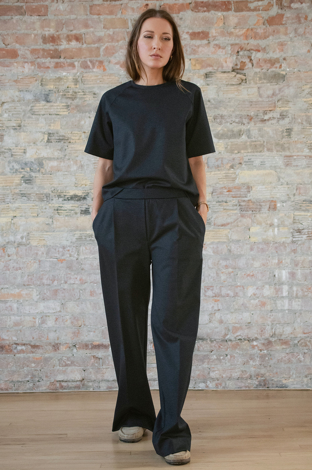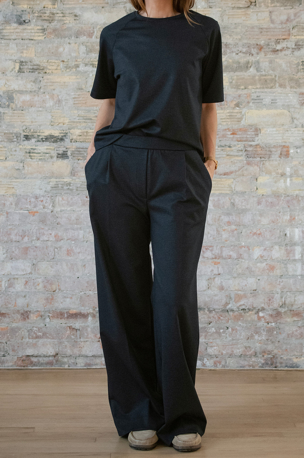 A sleek take on a classic, crafted from structured ponte fabric with the rich look of dark denim. This raglan tee features a clean, tailored fit with subtle stretch, combining sporty sleeve detailing with a polished silhouette. Perfect for wearing solo or pairing with the matching trouser.
