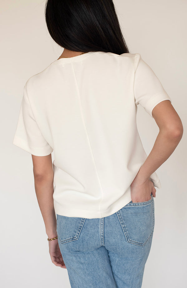 A refined take on the everyday tee. This slightly cropped t-shirt is made from a soft modal micro scuba fabric that offers a smooth feel with a structured drape. Designed in a clean ivory shade, it features a slightly boxy...