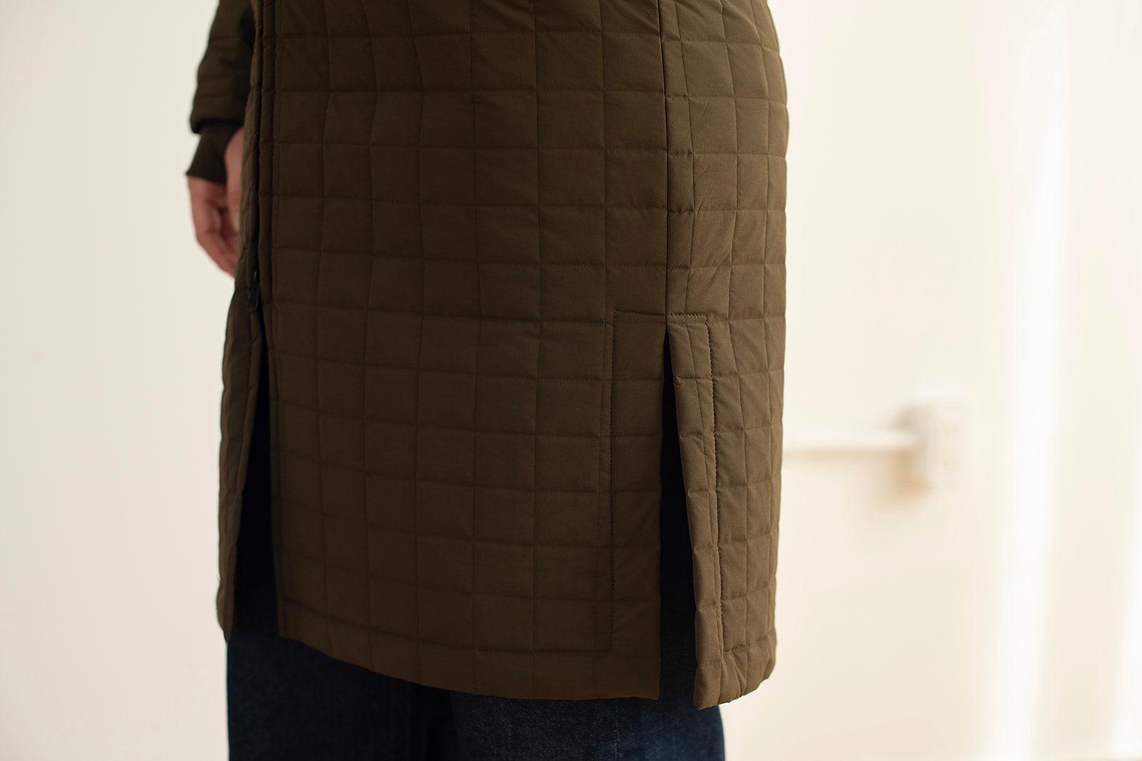 Minimal and technical with a modern silhouette. This medium-weight quilted coat is designed for modular warmth and everyday versatility. Cut in an elongated shape with side seam slits for ease of movement, it features a double-ended zipper, welt pockets, a cozy hood, and soft knit cuffs with thumbholes for added function and comfort. Wear it on its own or layer it with the matching overlay vest for extra insulation.