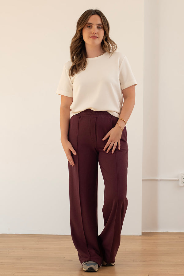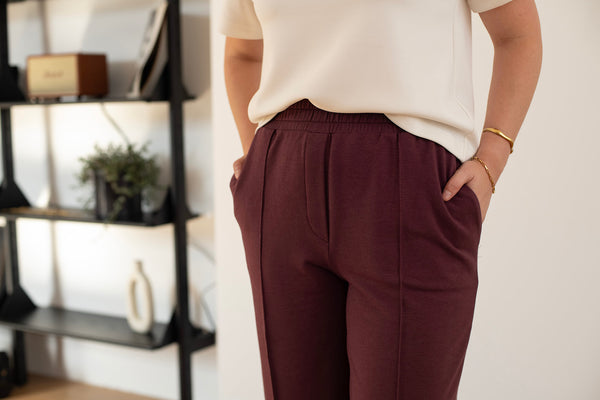 An elevated take on laid-back comfort. The Wine Bamboo Trouser offers a sleek, tapered silhouette with a sewn-in pin-tuck detail along the front leg for a lengthening effect. Designed with an easy 2" elastic waistband, discreet quarter-top pockets, and a...