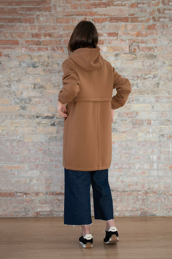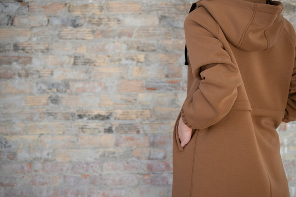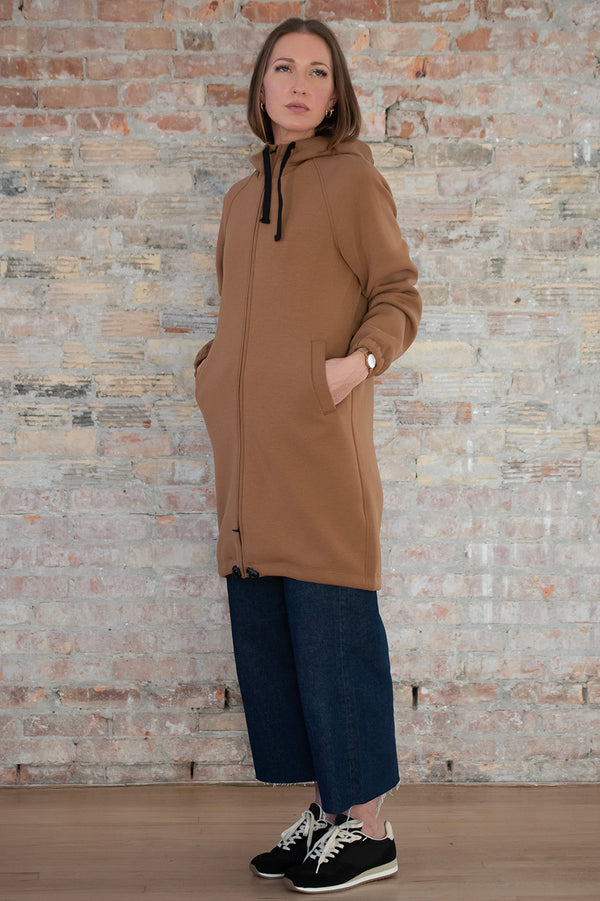 Fabric Content - Water Repellent 28%Rayon, 67%Polyester, 5%Spandex Deep Back yoke, Drawstring waist controlled  hand/gentle  wash cold; hang to dry. 100% Made in Canada  Fit is oversized, size down for more of a slimmer fit.