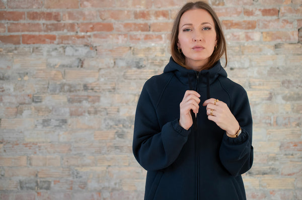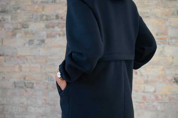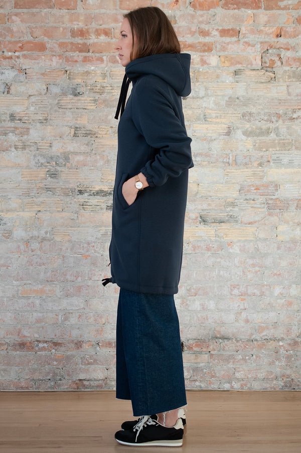 Fabric Content - Water Repellent 28%Rayon, 67%Polyester, 5%Spandex Deep Back yoke, Drawstring waist controlled  hand/gentle  wash cold; hang to dry. 100% Made in Canada  Fit is oversized, size down for more of a slimmer fit.
