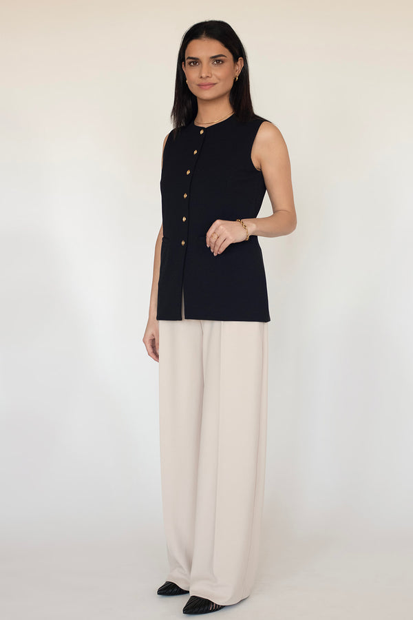 Tailored and polished, this long-line vest in black scuba crepe is designed to move with you. It buttons down to the waist before splitting back, creating shape and flow from the waist down. The fit is structured through the bust...