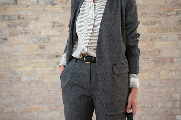 Effortlessly versatile, this collarless blazer is designed to dress up or down with ease. Crafted from the same soft, stretchy heathered knit fabric as the trousers and vest, it features functional welt pockets and a clean, modern silhouette for a...