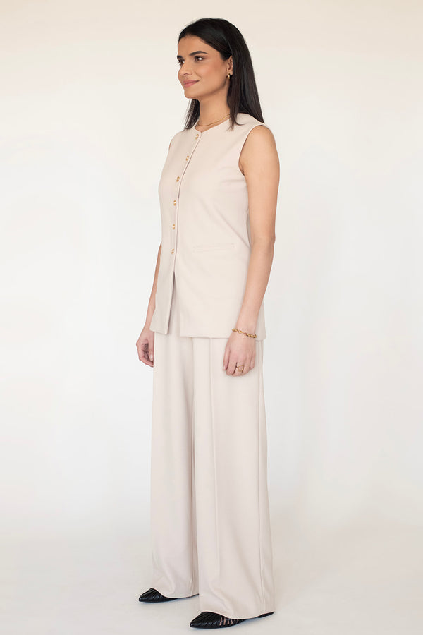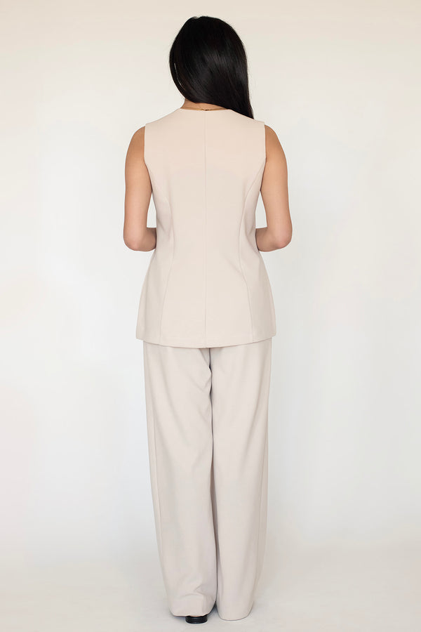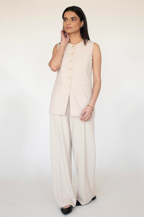 Elegant and structured, this long-line vest in cream scuba crepe offers a refined silhouette with soft movement. Buttoned to the waist, it then splits back to create gentle shape through the hem. Princess seams provide a tailored fit through the...